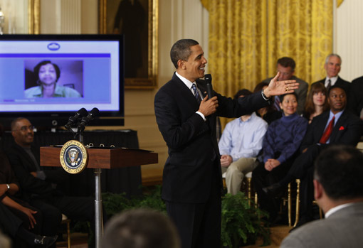 奧巴馬當(dāng)日在白宮首次以網(wǎng)絡(luò)視頻方式回答網(wǎng)友及現(xiàn)場民眾代表的提問。就業(yè)、醫(yī)療、教育、房貸等民生問題是當(dāng)日奧巴馬網(wǎng)絡(luò)答疑的重點(diǎn)。