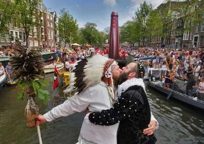 中新網(wǎng)8月4日電 荷蘭阿姆斯特丹市長科恩8月1日為五對同性戀人主持婚禮,掀起該市支持同性戀者年度水上大游行的高潮。