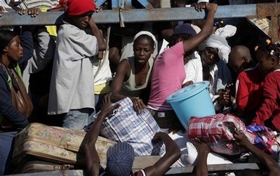 中新網1月19日電 據(jù)外電19日報道,數(shù)以千記的海地災民爭相擠上開往太子港郊區(qū)的公共汽車,希望在那里能夠更容易的找到食物和水。