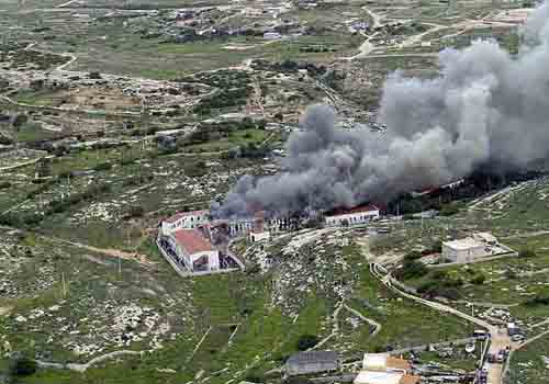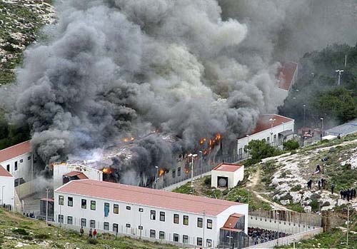 2月18日,在意大利南部蘭佩杜薩島,濃煙從一處移民收容中心升起。據(jù)當(dāng)?shù)鼐椒Q,當(dāng)天,一些被拘留在此的非法移民試圖逃跑失敗后,便縱火焚燒該收容中心,造成多人受傷。
