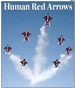 當(dāng)“Topgun”表演時,16名隊(duì)員的飛行時速可以達(dá)到驚人的193公里,但每名隊(duì)員之間的距離有時只有幾英寸之遠(yuǎn)。他們猶如一只只巨大的蝙蝠在空中急速穿梭,并以密集編隊(duì)在空中翻飛并不停變換隊(duì)形,其技巧和真正的“紅箭”飛行表演隊(duì)不相上下,精湛技術(shù)令人叫絕,壯觀場面可謂酷到極點(diǎn)。但顯然和“紅箭”不同的是,他們表演時無須使用任何飛機(jī),全憑自己的身體在空中“肉搏”。