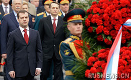 梅德韋杰夫在亞歷山大花園克里姆林宮紅墻下向無(wú)名烈士墓敬獻(xiàn)了花圈。俄羅斯總理普京、各部委代表、衛(wèi)國(guó)戰(zhàn)爭(zhēng)老戰(zhàn)士都參加了敬獻(xiàn)花圈儀式。