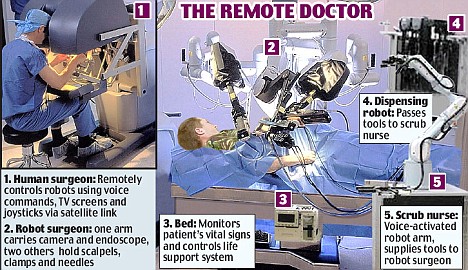 為了挽救更多士兵的生命,五角大樓已經(jīng)投資875萬(wàn)英鎊,與美國(guó)加州斯坦福研究院下屬的高科技公司簽訂制造多功能機(jī)器人的合約,包括名為“療傷機(jī)”的機(jī)器人醫(yī)生。這種機(jī)器人有三條手臂,一條用來(lái)控制內(nèi)診鏡,讓人類醫(yī)生可以看到傷者身體內(nèi)部情況,另外兩條手臂則拿著外科手術(shù)工具。此外,還有一種“擦洗護(hù)士”機(jī)器人,負(fù)責(zé)為機(jī)器人醫(yī)生傳遞各種工具。這些機(jī)器人也能與病人交談,安慰他們,以及問(wèn)他們一些問(wèn)題。