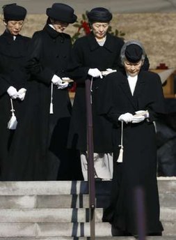 據(jù)日本共同社報(bào)道,現(xiàn)在的天皇夫婦、秋篠宮夫婦等皇族成員、首相麻生太郎等三權(quán)之長(zhǎng)、昭和天皇的五女兒島津貴子等親屬、宮內(nèi)廳干部及昭和天皇過(guò)去的侍從等近80人參加了在武藏野陵舉行的“山陵儀式”。