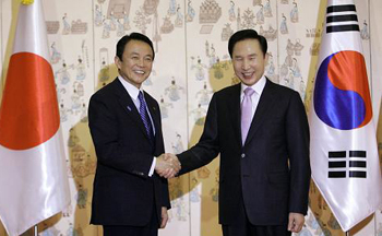 據(jù)韓國媒體報道,李明博說,希望今年能成為推動韓日面向未來的、成熟的伙伴關系取得實質(zhì)性成果的開端。他期待韓日雙方能展開密切合作,共同克服目前的經(jīng)濟危機,并希望雙方合作擴展到氣候變化、能源問題和反恐等全球性問題。