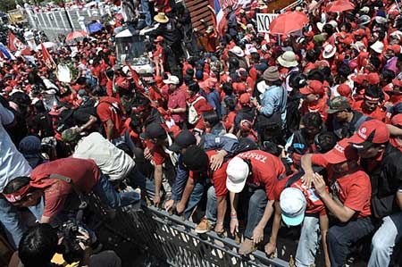 警方說,約二萬名身穿深紅色T恤的示威者聚集在政府大樓外面。有人企圖推翻一輛警車,接著一批手持鐵錘和鋼絲鉗的人剪爛了用來封鎖大樓前公路的刀片刺網(wǎng)。