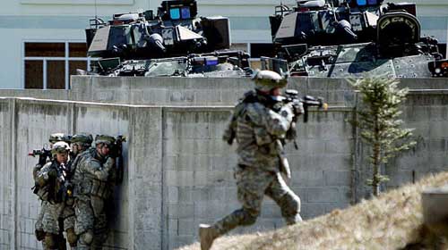 中新網(wǎng)3月11日電 據(jù)韓國《中央日報》報道,10日是韓美“關(guān)鍵決斷(key resolve)”聯(lián)合軍事演習的第二天,京畿道抱川駐韓美軍羅德里格斯(Rodriguez)射擊場上,韓美海軍展開巷戰(zhàn)訓(xùn)練。美軍士兵正朝著假想敵軍占領(lǐng)的建筑物前進。