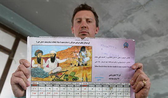 據(jù)悉,英軍士兵在塔利班據(jù)點(diǎn)內(nèi)一面墻上發(fā)現(xiàn)這本月歷。與普通的美女、跑車或者風(fēng)景月歷不同,塔利班月歷一月份封面人物是基地組織頭目拉登和塔利班最高頭目奧馬爾,他們身邊放著錢和武器,手指著被塔利班炸毀的巴米揚(yáng)大佛。二月份月歷封面是一個塔利班墳場。這本月歷上不僅有普什圖語,而且還有阿拉伯語、波斯語和英語。
