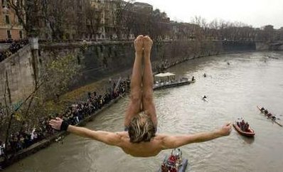 據(jù)臺(tái)灣“東森新聞”報(bào)道,當(dāng)你看到綽號(hào)“泰山”的男子,又出現(xiàn)在意大利臺(tái)伯河上方時(shí),你就知道新的一年又來(lái)了!他將從大橋上一躍而下,高度總共有17米,救難人員已經(jīng)在一旁待命;當(dāng)他優(yōu)雅地跳到臺(tái)伯河中,救難人員立刻開(kāi)救生艇過(guò)去拉他一把。