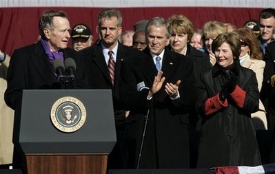 據(jù)“中央社”報道,布什與親近家人及高層官員,參加核子動力航空母艦“布什號”(USS George H.W. Bush)下水服役儀式?偨y(tǒng)當(dāng)選人奧巴馬1月20日進(jìn)入白宮時,布什將卸下總統(tǒng)職務(wù)。