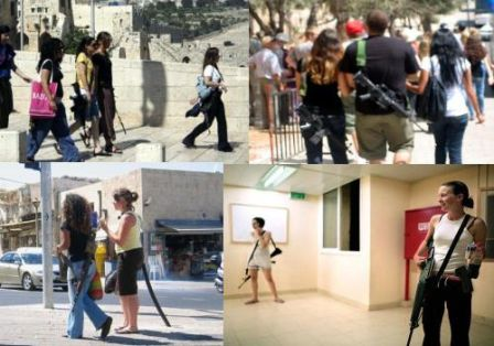 觀察蘿蕾博客上的照片可知,這些年輕女孩可能是陸軍士兵,從她們槍把子上面的紫藍(lán)色綢帶上看出來,有些是專業(yè)的M16步槍,屬軍用裝備,而非私人護(hù)身之用。加上以色列人不管男女都要服兵役,因此就算是回家休假槍也不離身,才能確保生命安全。