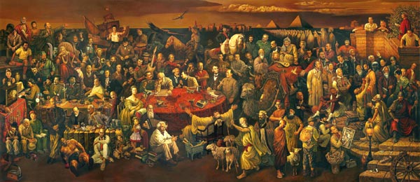 這幅油畫長6米、高2.6米,繪有103位世界名人,中國的萬里長城、埃及的金字塔、英國的巨石陣等地標(biāo)作為背景出現(xiàn)在油畫中。