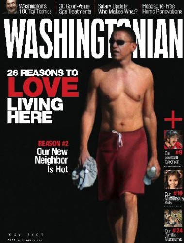 《華盛頓人》雜志政治記者Garrett Graff說,讀者一看到5月號(hào)的封面之后,各種評(píng)論和意見就蜂擁而至。這張封面照片是奧巴馬僅穿著一條游泳褲,帶著墨鏡,上身赤裸。旁邊標(biāo)題寫著:“我們的新鄰居很火辣”(Our new neighbor is hot)。