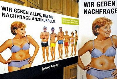據(jù)法新社報道,德國一家內衣公司5月1日在柏林著名商業(yè)街庫達姆街推出了一個1000平方英尺的巨幅電子廣告牌,廣告牌上是德國政治家著內衣的形象,其中包括德國總理默克爾,她身穿一套紫色胸罩和運動短褲。廣告牌上的文字寫著:“我們盡全力增加需求!