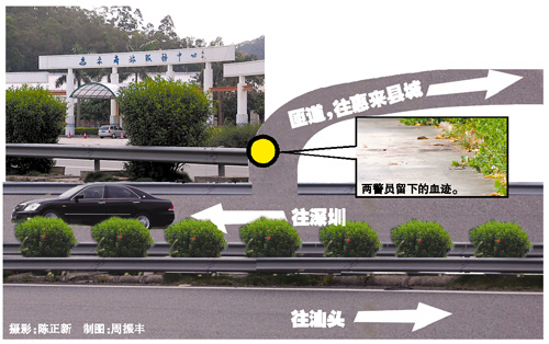 昨日記者來(lái)到事發(fā)現(xiàn)場(chǎng),幾位揭陽(yáng)市公安局交警支隊(duì)惠來(lái)高速公路大隊(duì)的民警正在現(xiàn)場(chǎng)做警戒。警戒線圍起的事發(fā)地點(diǎn),就位于深汕高速進(jìn)入服務(wù)區(qū)路口不遠(yuǎn)處。這個(gè)路口可以通往惠來(lái)縣城,也可通往惠來(lái)高速公路大隊(duì)。