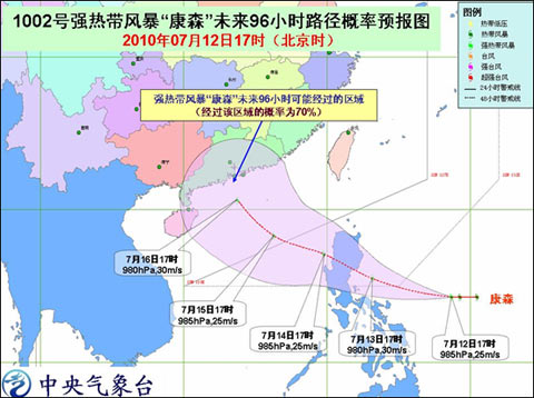 預(yù)計,“康森”將以每小時20-25公里的速度向西偏北方向移動,強(qiáng)度還將有所加強(qiáng),并逐漸向菲律賓呂宋島東部一帶沿?拷瑢⒂14日傍晚前后進(jìn)入南海東部海面。