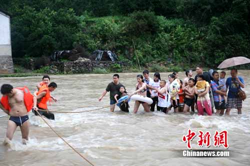 中新網衢州7月18日電(記者 江耘 通訊員 饒小飛)今天下午,浙江衢州石梁鎮(zhèn)坎底村水庫因暴雨致水位突漲,18名正在水庫里休閑渡假的游客被困水庫中央,其中7人是小孩。后在衢州柯城消防架設“安全通道”下,18名游客被安全救出。