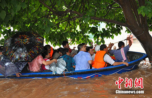 按照“由近及遠(yuǎn),先老人小孩,再大人”的救援思路,20余名群眾在消防官兵的引導(dǎo)、攙扶、背下,于15時50分被順利救出。此時,洪水仍在不斷上漲。必須加快速度!在當(dāng)?shù)孛癖呐浜舷,消防全勤指揮部將救援人員分為搜救、沖鋒、接應(yīng)、器材準(zhǔn)備四個小組,并利用沖鋒舟搜尋被困群眾。由于水流太大,消防官兵不能用沖鋒舟從街道中心直線解救被困群眾,只能沿街道兩邊水流相對較緩處逐步搜尋。消防官兵用喊話、逐屋搜尋等方式,將群眾從水中逐一解救到船上。第一船12名群眾被告順利救出,第二船、第三船……
