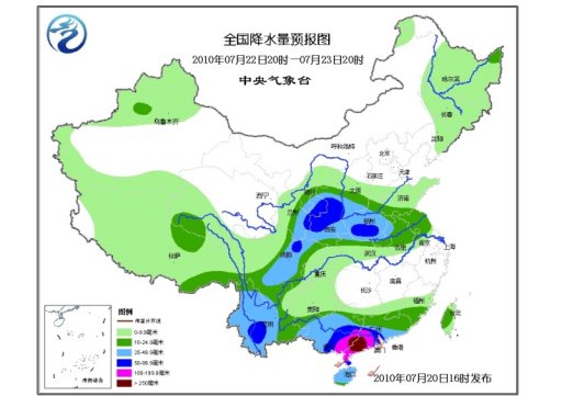 21日20時至22日20時,新疆西部、青海南部和東部、西藏中部、甘肅東部、寧夏、陜西大部、山西南部和西北部、內(nèi)蒙古東北部、東北大部、黃淮大部、江淮、江漢、江南西部和南部、華南大部、西南地區(qū)大部等地有小到中雨或陣雨,其中,甘肅東部、陜西南部、四川北部、河南中南部、湖北北部、安徽中北部、江蘇西北部、云南東部、廣西東南部、廣東大部、海南等地有大雨或暴雨;廣東沿海、海南北部等地有大暴雨,局部特大暴雨;上述局部地區(qū)并伴有短時雷雨大風等強對流天氣。新疆中部、內(nèi)蒙古西部、東北東部等地有4~6級風。受熱帶風暴“燦都”的影響,南海北部海域將有7~9級大風,“燦都”中心經(jīng)過的附近海面的風力可達10~11級,部分海域陣風可達12級。