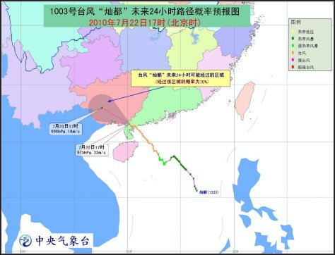 預計,“燦都”將以每小時15公里左右的速度向西偏北方向移動,將于22日晚上進入廣西境內(nèi),強度逐漸減弱。