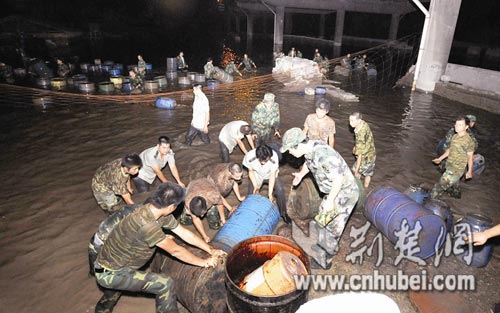 昨晚8時許,東西湖區(qū)環(huán)保局監(jiān)察大隊夏大隊長表示,接到反映后,下午立即展開了調(diào)查,發(fā)現(xiàn)部分桶內(nèi)還有液態(tài)物質(zhì)。東西湖區(qū)政府立即組織500多名民兵預(yù)備役人員,配合化工桶倉庫的業(yè)主,挑燈夜戰(zhàn)連續(xù)打撈和轉(zhuǎn)移,包括江中平臺上的化工桶在內(nèi),共3000只化工桶將不會在江中過夜;與此同時,區(qū)環(huán)保監(jiān)測站對桶內(nèi)液態(tài)物質(zhì)進行化驗,同時對浸泡化工桶的江水,每隔兩小時取一次樣進行化驗,密切監(jiān)測該江段的水質(zhì)情況。