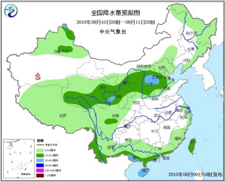9日夜間到10日,舟曲縣及白龍江流域上游陰有陣雨或雷陣雨,累積降雨量一般有5~15毫米。