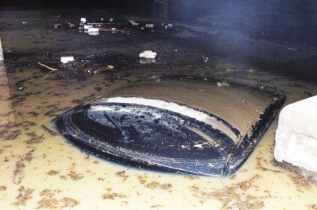 昨日凌晨1點(diǎn)過,還在睡夢中的張先生被窗外的雷鳴聲驚醒,接著他聽到樓下傳來喊叫,“車庫被淹了,快把外面的車開走!睆埾壬偷貜拇采吓榔饋恚鸺被鹆堑嘏芟蜍噹鞎r,發(fā)現(xiàn)雨下不夠半小時,車庫的積水已經(jīng)漲到3米深,里面的7輛汽車全部被淹沒頂。直到昨日下午7時,車庫內(nèi)的淤泥還未被清理干凈。 (記者 薛小龍 攝影 呂甲 實(shí)習(xí)生 周烜)
