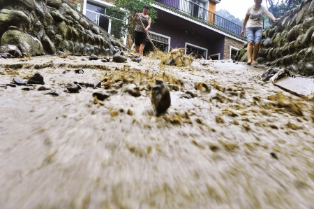 13日凌晨零點(diǎn)20分左右,都江堰上空突降暴雨,局部地區(qū)達(dá)到142毫米。強(qiáng)降雨造成都江堰城區(qū)和部分山區(qū)出現(xiàn)險情,城區(qū)內(nèi)多處民房和街道被淹。部分板房安置區(qū)因提前備好抽水設(shè)備,積水短時間內(nèi)即被排出。都江堰水務(wù)局防汛辦主任張普龍說,這是近10年來,都江堰短時最大強(qiáng)降雨。
