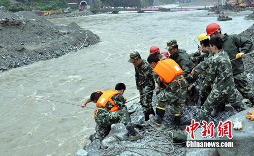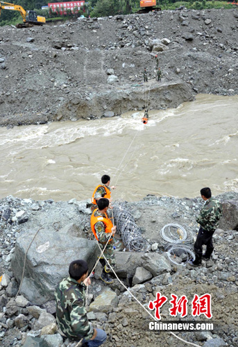 中新網(wǎng)映秀8月18日電(郭永全 張浪 鄢銀嬋)18日早6點,汶川消防大隊映秀消防站接到武警水電部隊求助電話,在位于映秀鎮(zhèn)堰塞湖處處理淤泥沙石拓寬河道的數(shù)十名機械工人因河道加寬,水流湍急,無法從原來搭設(shè)的繩橋往返對岸進行作業(yè)。