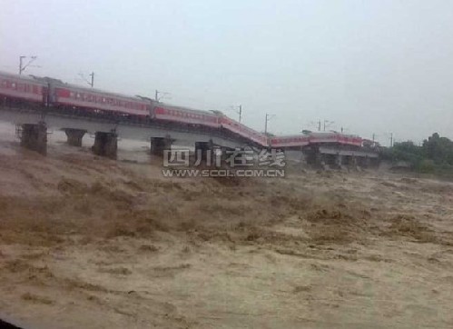據(jù)廣漢市政府電話報(bào)告,鐵路寶成線跨石亭江大橋(廣漢小漢境內(nèi))沖毀兩個(gè)橋墩三孔,西安至昆明客運(yùn)車懸掛橋上,廣漢市已積極組織力量正在進(jìn)行搶險(xiǎn)和轉(zhuǎn)移旅客。