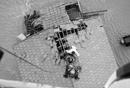 經(jīng)過近兩個小時的飛行,B~7312救助直升機(jī)到達(dá)丹東機(jī)場中轉(zhuǎn)加油。此時傳來的消息是:洪水已經(jīng)漲至齊腰深,4名群眾被困“孤島”。由于當(dāng)?shù)靥鞖馔蝗蛔儔,潘偉?duì)長、副駕駛李春雨數(shù)次嘗試?yán)@開雷雨區(qū),均未成功。直升機(jī)隨即返航。
