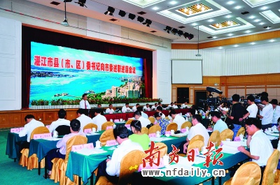 如果這幾天到湛江,詢問(wèn)當(dāng)?shù)厥忻窈驼賳T,當(dāng)前最關(guān)注的事件是什么,他們一定會(huì)說(shuō)是“縣(市、區(qū))委書記述職述廉會(huì)議”。昨日上午,該會(huì)議在湛江海濱賓館國(guó)際會(huì)議中心召開,湛江10位縣(市、區(qū))委書記先后上臺(tái),向會(huì)場(chǎng)上69位評(píng)委———市委委員、候補(bǔ)委員,市紀(jì)委委員———匯報(bào),會(huì)議全程被網(wǎng)絡(luò)、電視直播。與此同時(shí),湛江市官網(wǎng)“碧海銀沙”上,網(wǎng)民“頂”、“批”、“拍磚”不斷。為學(xué)習(xí)湛江的民主經(jīng)驗(yàn),外省8個(gè)地級(jí)市派出了觀摩團(tuán)與會(huì)。