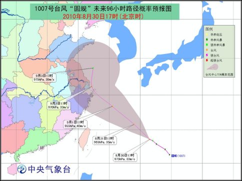 預(yù)計(jì),“圓規(guī)” 將以每小時(shí)15公里左右的速度向西北方向移動(dòng),強(qiáng)度還將繼續(xù)加強(qiáng),將于9月1日白天進(jìn)入東海南部海面,以后逐漸向浙江中部到江蘇中部一帶沿海靠近。30日晚上至31日白天,“圓規(guī)”對(duì)我國(guó)近海無(wú)影響。