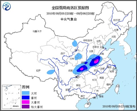 9月5日20時到6日20時,四川東北部、重慶北部和西部、陜西南部、湖北西北部、山西南部、河南大部、山東西南部以及寧夏南部、甘肅東北部、內(nèi)蒙古西部、西藏東部的部分地區(qū)等地有大雨或暴雨,其中,河南中部、四川盆地東北部、重慶西北部等地局部有大暴雨;上述部分地區(qū)并伴有短時雷雨大風等強對流天氣。