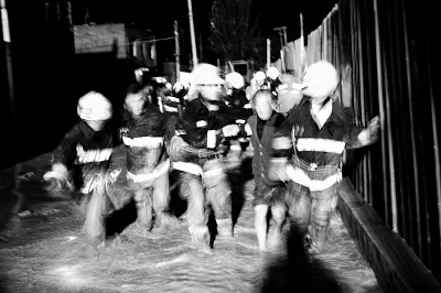 22時45分,所調(diào)集的東崗中隊一臺照明車正趕往現(xiàn)場。23時33分,特勤一中隊7名戰(zhàn)斗員到達(dá)現(xiàn)場。由于道路房屋都被泥水淹沒,給救援工作帶來了很大的困難。官兵們手抓大繩,走在齊腰深的淤泥中,一步一步到達(dá)現(xiàn)場后,發(fā)現(xiàn)多名群眾被困在房里面。時間就是生命!中隊長周暉立即命令一中隊官兵迅速展開救援,由于泥水淹至膝蓋,所有官兵只能緩慢的靠近被困群眾,然后一個個攙扶的進(jìn)行轉(zhuǎn)移。