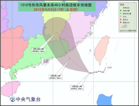 預(yù)計(jì),風(fēng)暴中心將以每小時(shí)10-15公里的速度向偏西方向移動(dòng),以后逐漸轉(zhuǎn)向西北方向移動(dòng),并向廣東東部到福建南部一帶沿?拷瑥(qiáng)度逐漸加強(qiáng),將于9日夜間到10日上午在這一帶沿海登陸。