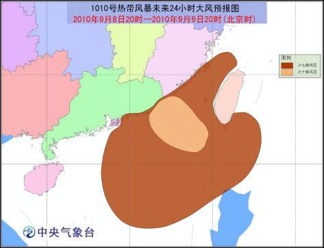 受熱帶風(fēng)暴和西南季風(fēng)共同影響,9月8日晚上到9日白天,巴士海峽、巴林塘海峽、臺(tái)灣海峽、南海北部和中部的偏東海面、臺(tái)灣東南部海面以及臺(tái)灣南部沿海、福建中南部沿海、廣東中東部沿海將有7-9級(jí)大風(fēng),風(fēng)暴中心經(jīng)過(guò)的附近海面或地區(qū)的風(fēng)力有9-10級(jí),陣風(fēng)可達(dá)11-12級(jí);福建中南部沿海、廣東中東部沿海、臺(tái)灣中南部以及海南南部、廣西南部沿海將有大雨或暴雨。