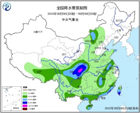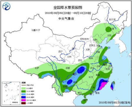 8日20時(shí)至9日20時(shí),西藏中東部、青海南部、甘肅南部、寧夏南部、陜西、內(nèi)蒙古中部、華北大部、黃淮、江淮、江漢、江南大部、華南以及西南地區(qū)等地有小到中雨或陣雨,其中,四川盆地、川西高原中部、甘肅東南部、陜西南部、重慶西部和北部、福建東南部沿海、廣東中東部沿海、臺(tái)灣中南部等地有大雨或暴雨,四川盆地東北部局地有大暴雨;內(nèi)蒙古中部、山東半島東部、蘇皖中部、江西西部、廣西東南部、海南南部等地的部分地區(qū)有大雨;上述局部地區(qū)并伴有短時(shí)雷雨大風(fēng)或冰雹等強(qiáng)對(duì)流天氣。新疆北部、甘肅西部、內(nèi)蒙古中西部和東南部等地有4~6級(jí)風(fēng)。受10號(hào)熱帶風(fēng)暴影響,臺(tái)灣海峽、臺(tái)灣以東洋面和以南海域、南海東北部有7~9級(jí)大風(fēng),風(fēng)暴中心經(jīng)過(guò)的附近海域風(fēng)力有10級(jí),陣風(fēng)11~12級(jí);東海南部有5~7級(jí)東南風(fēng)。黃海中北部有5~6級(jí)旋轉(zhuǎn)風(fēng);南海中部有5~6級(jí)西南風(fēng)。