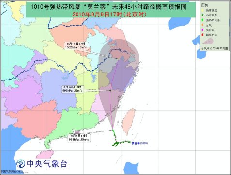 中新網(wǎng)9月9日電 據(jù)中央氣象臺網(wǎng)站消息,中央氣象臺9月9日18時發(fā)布臺風(fēng)黃色預(yù)警:今年第10號熱帶風(fēng)暴“莫蘭蒂”已于9月9日14時加強為強熱帶風(fēng)暴,17時“莫蘭蒂”的中心位于福建廈門南偏東大約220公里的南海東北部海面上,就是北緯22.6度,東經(jīng)118.9度,中心附近最大風(fēng)力有10級(25米/秒),中心最低氣壓為988hPa。