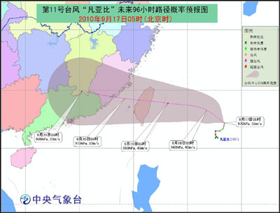 預(yù)計(jì),“凡亞比”中心將以每小時10公里左右的速度向西偏北方向移動,逐漸向中國臺灣東部一帶沿海靠近,強(qiáng)度繼續(xù)加強(qiáng),將于19日白天在這一帶沿海登陸。