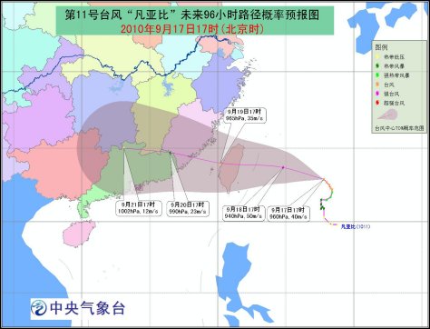 預(yù)計,“凡亞比”中心將以每小時10-15公里的速度先向西偏北方向移動,以后逐漸轉(zhuǎn)向偏西方向移動,移速將略有加快,強度繼續(xù)加強,并向我國臺灣東部一帶沿?拷,將于19日凌晨到白天在臺灣東部沿海登陸;之后,“凡亞比”將穿越臺灣島進入臺灣海峽,向福建中部到廣東東部一帶沿?拷。