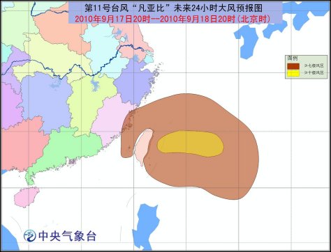 受其影響,17日20時至18日20時,臺灣以東洋面、東海南部、臺灣東部及北部沿海、福建中北部沿海、臺灣海峽將有7-9級大風(fēng),部分海域風(fēng)力可達10-12級,“凡亞比”中心經(jīng)過的附近海面的風(fēng)力有13-16級;臺灣東部將有中到大雨,局部地區(qū)有暴雨。