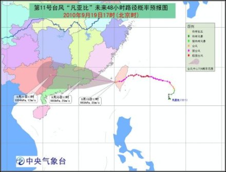 今年第11號強臺風(fēng)“凡亞比”于19日14時在中國臺灣省臺南縣楠西鄉(xiāng)境內(nèi)減弱為臺風(fēng),17時臺風(fēng)中心位于臺南縣七股鄉(xiāng)境內(nèi),就是北緯23.1度、東經(jīng)120.1度,中心附近最大風(fēng)力有12級(35米/秒),中心最低氣壓為965百帕。