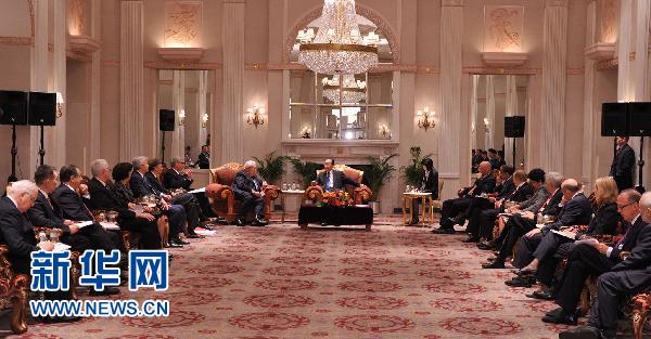 當(dāng)?shù)貢r間9月22日上午,在紐約華爾道夫飯店一間寬敞的會議室里,溫家寶總理望著坐在身旁的基辛格,以40多年來中美關(guān)系的發(fā)展入題,與美國企業(yè)、金融和學(xué)術(shù)界一些著名人士展開座談和交流。