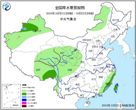 21日08時(shí)至22日08時(shí),新疆北部和西部、西藏東部、青海大部、川西高原中北部、內(nèi)蒙古東北部等地有小雨(雪)或雨夾雪;甘肅中東部、寧夏中南部、陜西西南部、四川盆地西北部、云南西北部、浙江東南部、福建大部、廣東東部、臺(tái)灣等地有小到中雨或陣雨,其中,福建東南部、臺(tái)灣等地有大雨,局地有暴雨;上述局部地區(qū)并伴有短時(shí)雷雨大風(fēng)等強(qiáng)對(duì)流天氣。新疆北部、東南部沿海等地有4~6級(jí)風(fēng),新疆西北部山口地區(qū)風(fēng)力可達(dá)8~9級(jí)。南海東北部海域的風(fēng)力將有10~13級(jí)、陣風(fēng)可達(dá)14~15級(jí);“鲇魚”中心經(jīng)過的附近海域的風(fēng)力將有14~16級(jí)、陣風(fēng)可達(dá)17級(jí)及以上;東海大部、臺(tái)灣海峽、南海西北部將有7~9級(jí)大風(fēng)。