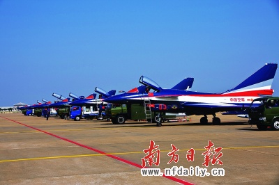 昨日中午12點(diǎn)15分,中國空軍八一飛行表演隊已經(jīng)飛抵珠海。伴隨著飛機(jī)引擎的轟鳴,3架以藍(lán)、白、紅為主色的殲10出現(xiàn)在珠海航展中心上空。3架飛機(jī)宛如三把直刺長空的利劍,連續(xù)兩次掠過藍(lán)天,然后相繼在珠海機(jī)場降落。約12點(diǎn)45分,另外4架殲10也相繼到達(dá)(見圖,陳俊攝)。這意味著換裝殲10飛機(jī)后的航展期間,八一飛行表演隊每天都將進(jìn)行一場飛行表演,準(zhǔn)備了18套動作,每次表演時間約22分鐘。