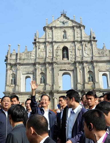 14日,溫家寶在澳門特別行政區(qū)行政長官崔世安的陪同下,先后參觀澳門大炮臺(tái)、澳門博物館、大三巴牌坊,考察了澳門生產(chǎn)力暨科技轉(zhuǎn)移中心、澳門工聯(lián)北區(qū)綜合服務(wù)中心、仁伯爵綜合醫(yī)院、澳門大學(xué)等機(jī)構(gòu),看望澳門廣大市民,和大家真情互動(dòng),深切了解澳門歷史和經(jīng)濟(jì)、社會(huì)發(fā)展情況。他還走訪市民家庭,了解澳門普通居民的生活現(xiàn)狀。