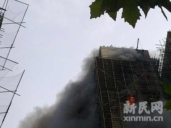 16時20分,大火持續(xù)到現(xiàn)在尚未被撲滅,大樓內(nèi)仍有居民尚未逃出,頂樓還有不少被困居民在等待救援。新民網(wǎng)記者在現(xiàn)場看見,經(jīng)過大火猛烈的炙烤,已經(jīng)有腳手架在往下掉落了,現(xiàn)場十分危險。