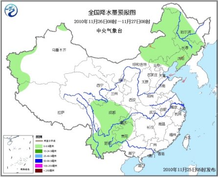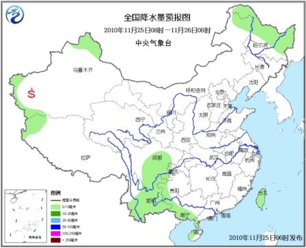 25日08時(shí)至26日08時(shí),新疆北部和西南部局部、西藏西部、黑龍江北部和東部等地有小雪(雨)或雨夾雪;四川中南部、云南大部、貴州西部、廣西西部和南部、海南西部以及臺(tái)灣等地有小雨或陣雨。東北北部等地有4~5級(jí)偏北風(fēng),東南部沿海有5~7級(jí)風(fēng);南疆盆地西部有揚(yáng)沙或浮塵天氣。。