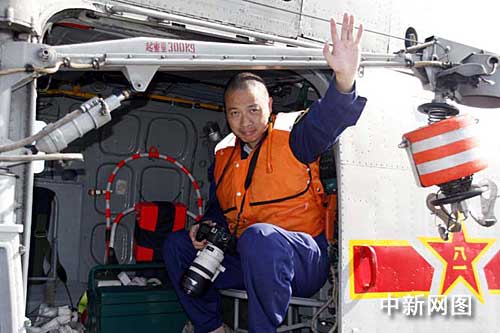 雖然直升機(jī)起飛尚有一段時(shí)間,但急性子的我還是檢查好相機(jī)等采訪拍攝裝備,穿上救生衣,早早地就跑到甲板上守侯著。艦上時(shí)間上午九點(diǎn)多,飛行員和乘機(jī)人員開始登機(jī),中央人民廣播電臺(tái)記者孫利特地趕來,給我拍了一幅起飛前在直升機(jī)上揮手的照片。